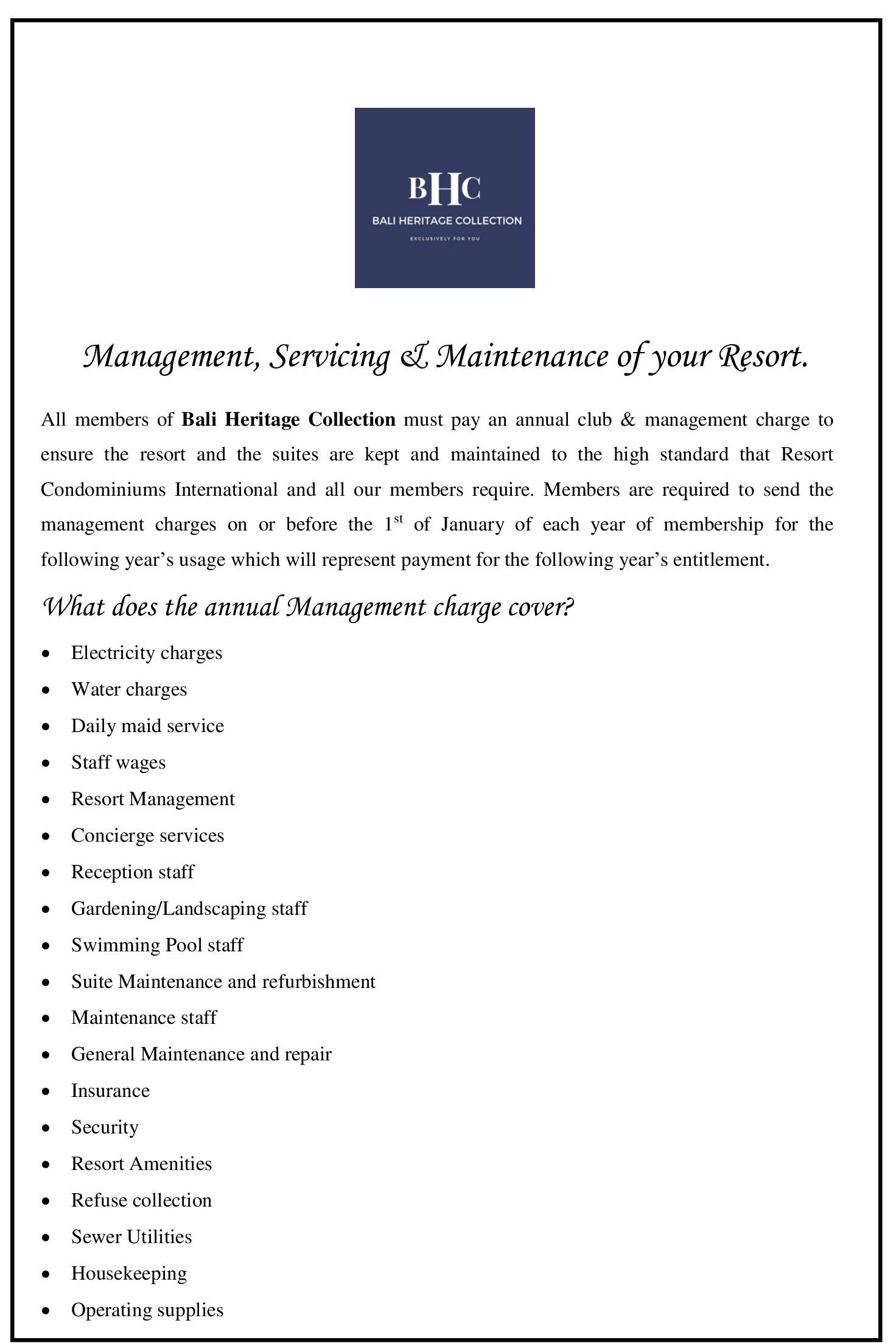 IMPORTANT MEMBER INFORMATION REGARDING YOUR BALI HERITAGE COLLECTION POINTS MEMBERSHIP AND YEARLY CLUB/MANAGEMENT CHARGES